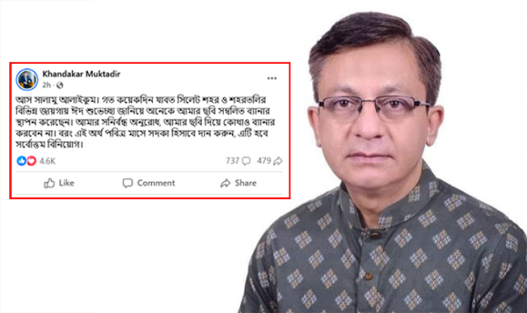তিনি লিখেন, “আস সালামু আলাইকুম। গত কয়েকদিন যাবত সিলেট শহর ও শহরতলির বিভিন্ন জায়গায় ঈদ শুভেচ্ছা জানিয়ে অনেকে আমার ছবি সম্বলিত ব্যানার স্থাপন করেছেন। আমার সনির্বন্ধ অনুরোধ, আমার ছবি দিয়ে কোথাও ব্যানার করবেন না। বরং এই অর্থ পবিত্র মাসে সদকা হিসাবে দান করুন, এটি হবে সর্বোত্তম বিনিয়োগ।”