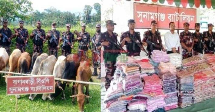 সুনামগঞ্জে কোটি টাকার ভারতীয় শাড়ি জব্দ, গরু আটক