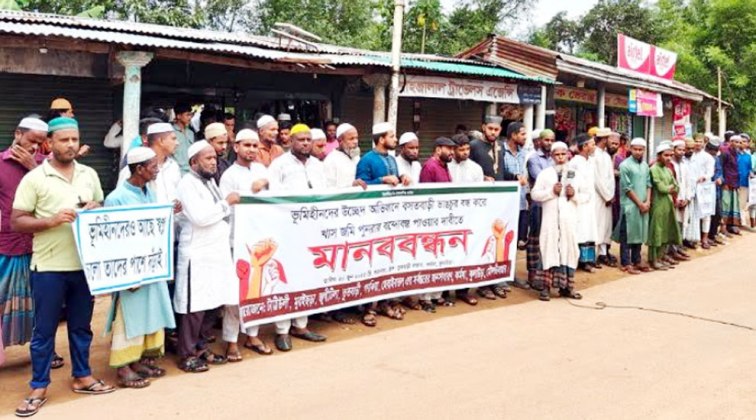 বৈশাখী নিউজ ডেস্ক: মৌলভীবাজারের কুলাউড়ায় খাসজমি থেকে ভূমিহীনদের উচ্ছেদ বন্ধ এবং বন্দোবস্ত পুনরায় প্রদানসহ বিভিন্ন দাবিতে মানববন্ধন করেছেন স্থানীয়রা।