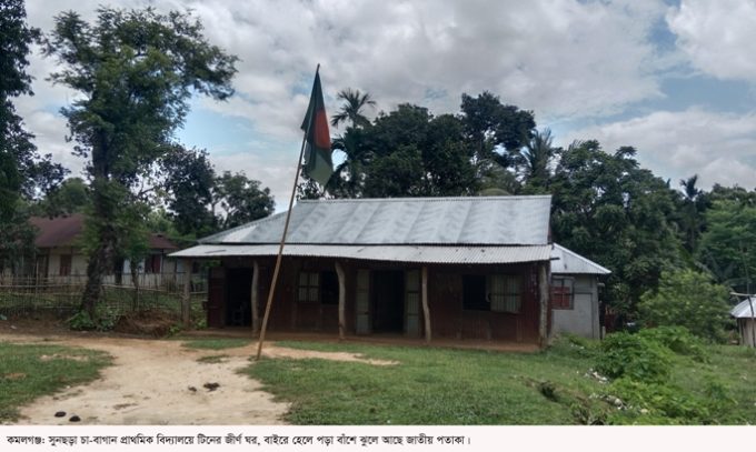 কমলগঞ্জ (মৌলভীবাজার) প্রতিনিধি: মৌলভীবাজারের কমলগঞ্জ উপজেলার সীমান্তবর্তী এলাকায় অবস্থিত সুনছড়া চা-বাগান। এর একটি টিলার ওপর টিনের জীর্ণ ঘর। বাইরে হেলে পড়া বাঁশে ঝুলে আছে জাতীয় পতাকা। ছোট কক্ষে বাঁশের বেড়া দিয়ে দুটি কক্ষ তৈরি হয়েছে। ছোট ছোট খুপরি ঘরে চলছে পাঠদান। জীর্ণ ঘরের মতো শিশুদের পোশাকও জীর্ণ। এটাই সুনছড়া চা-বাগানের স্কুল।