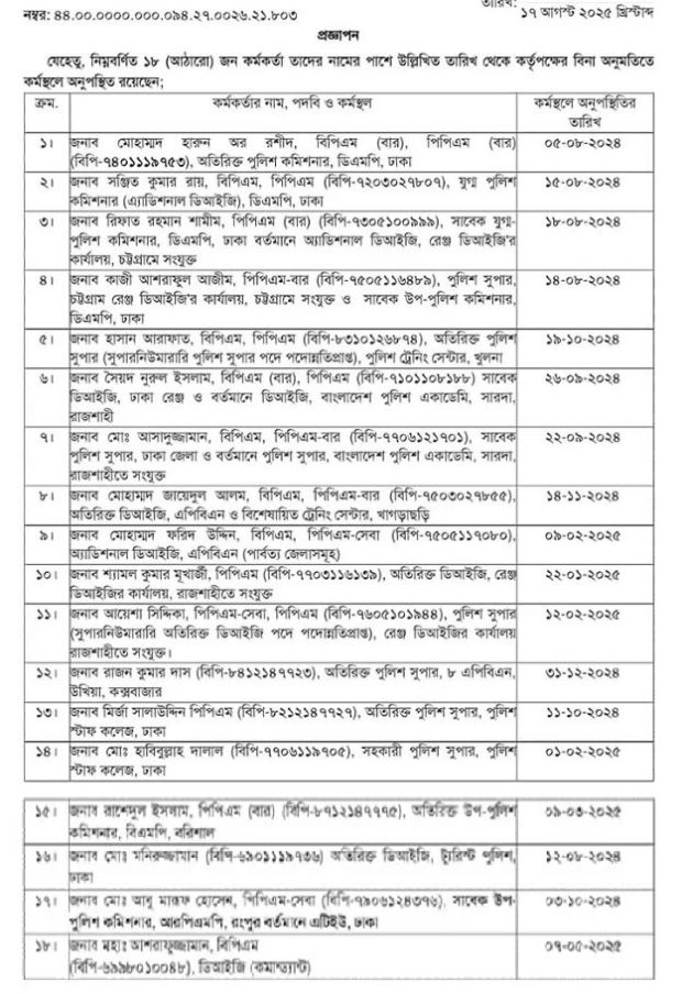 প্রজ্ঞাপনে বলা হয়, ১৮ জন কর্মকর্তাকে সরকারি কর্মচারী (শৃঙ্খলা ও আপিল) বিধিমালা, ২০১৮ এর ৩(গ) অনুযায়ী পলায়নের শাস্তিযোগ্য অপরাধে অভিযুক্ত হওয়ায় বিধি ১২ উপবিধি (১) অনুযায়ী তাদের নামের পাশে উল্লিখিত তারিখ থেকে চাকরি থেকে সাময়িক বরখাস্ত করা হলো।