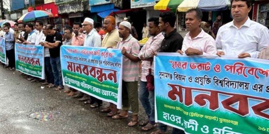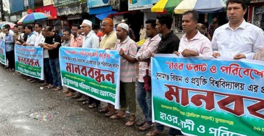 মঙ্গলবার (১৬ সেপ্টেম্বর) দুপুরে সুনামগঞ্জের পাঁচটি পরিবেশবাদী সংগঠনের যৌথ আয়োজনে শহরের আলফাত স্কয়ারে ঘণ্টাব্যাপী এই মানববন্ধন কর্মসূচি পালন করা হয়।