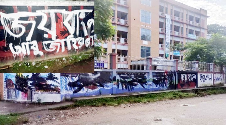 বৈশাখী নিউজ ডেস্ক: হবিগঞ্জ শহরের বিভিন্ন দেয়ালে দেয়ালে জুলাই আন্দোলনের সময় গ্রাফিতি লেখা হয়েছিল। ফুঠিয়ে তেলা হয়েছিল আন্দোলনের নানা চিত্রকর্ম। এছাড়াও লেখা হয়েছিল ফ্যাসিস্ট সরকারের বিরুদ্ধে নানা শ্লোগান। কিন্তু এবার রাতের আধারে জুলাই আন্দোলনের সেই গ্রাফিতি কালো কালি দিয়ে মুছে ফেলা হয়েছে। কোন কোন দেয়ালে আবার লোখা হয়েছে ‘জয় বাংলা’।