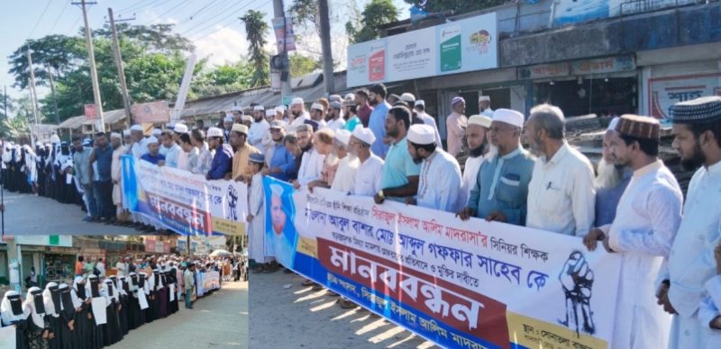 সিলেটে মাদরাসা শিক্ষক আবুল বাশারকে গ্রেপ্তারের প্রতিবাদে মানববন্ধন