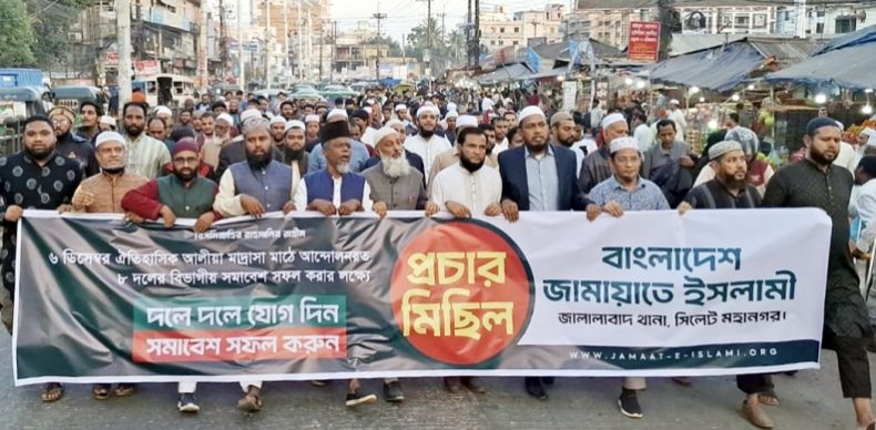 মিছিল সমাবেশে নেতৃবৃন্দ বলেন, আসন্ন জাতীয় নির্বাচনের আগে জুলাই জাতীয় সনদ বাস্তবায়ন আদেশের ওপর গণভোট, নির্বাচনে লেভেল প্লেয়িং ফিল্ডসহ পাঁচ দাবি ও গণভোটে ‘হ্যাঁ’ বিজয় নিশ্চিতে আগামী ৬ ডিসেম্বর শনিবার বেলা ১২টায় সিলেটের ঐতিহাসিক আলিয়া মাদ্রামা মাঠে ইসলামী ও সমমনা ৮ দলের সিলেট বিভাগীয় সমাবেশ অনুষ্ঠিত হবে। জামায়াত ও ৮ দলের সর্বস্তরের জনশক্তি ছাড়াও সিলেটবাসীর অংশগ্রহণে উক্ত সমাবেশ জনসমুদ্রে পরিনত হবে। ইনশাআল্লাহ। জাতীয় নির্বাচনের আগে জুলাই সনদ বাস্তবায়ন আদেশের ওপর গণভোট, নির্বাচনে লেভেল প্লেয়িং ফিল্ডসহ পাঁচ দাবি ও গণভোটে ‘হ্যাঁ’ বিজয় নিশ্চিতে আমাদের কর্মসূচী অব্যাহত থাকবে।